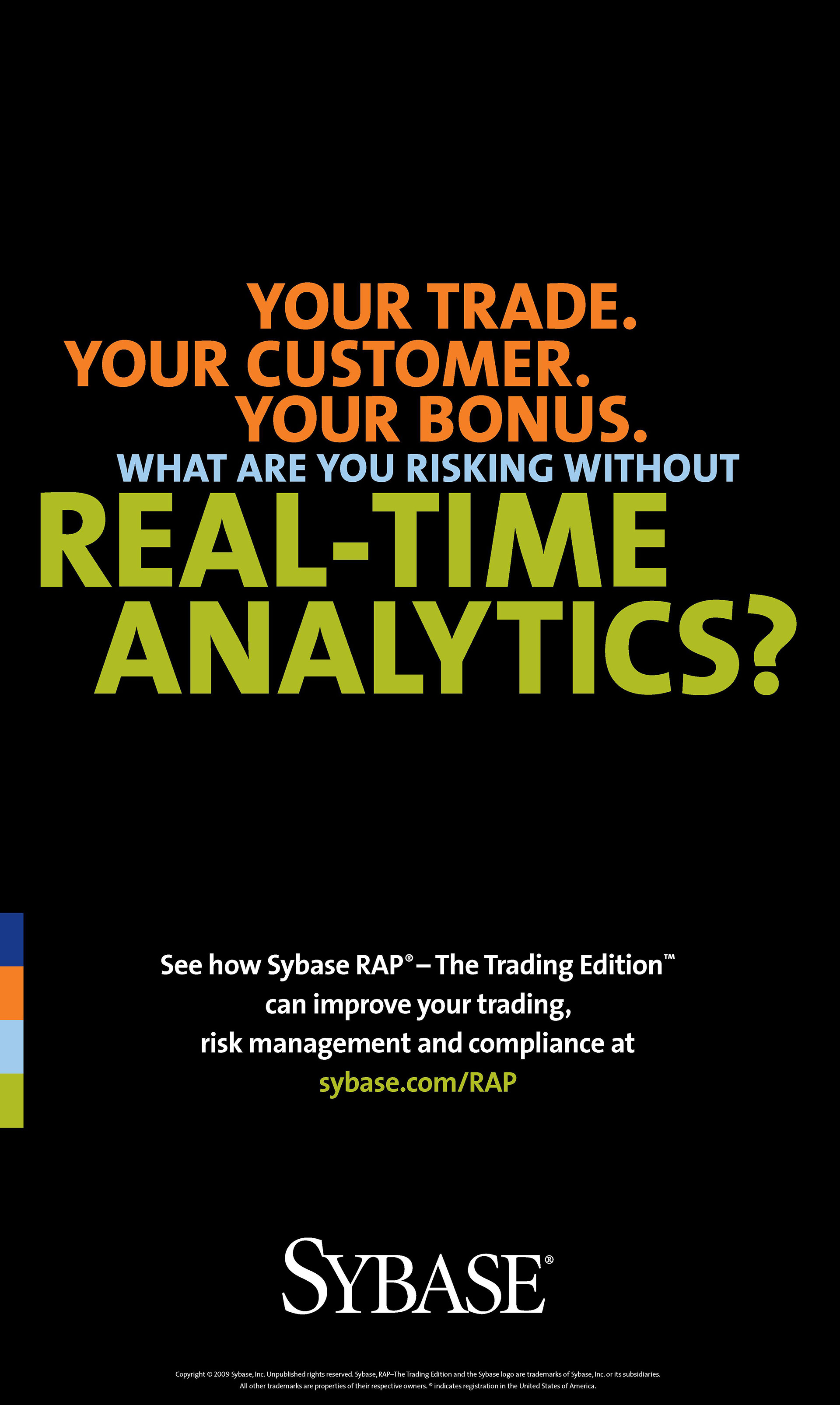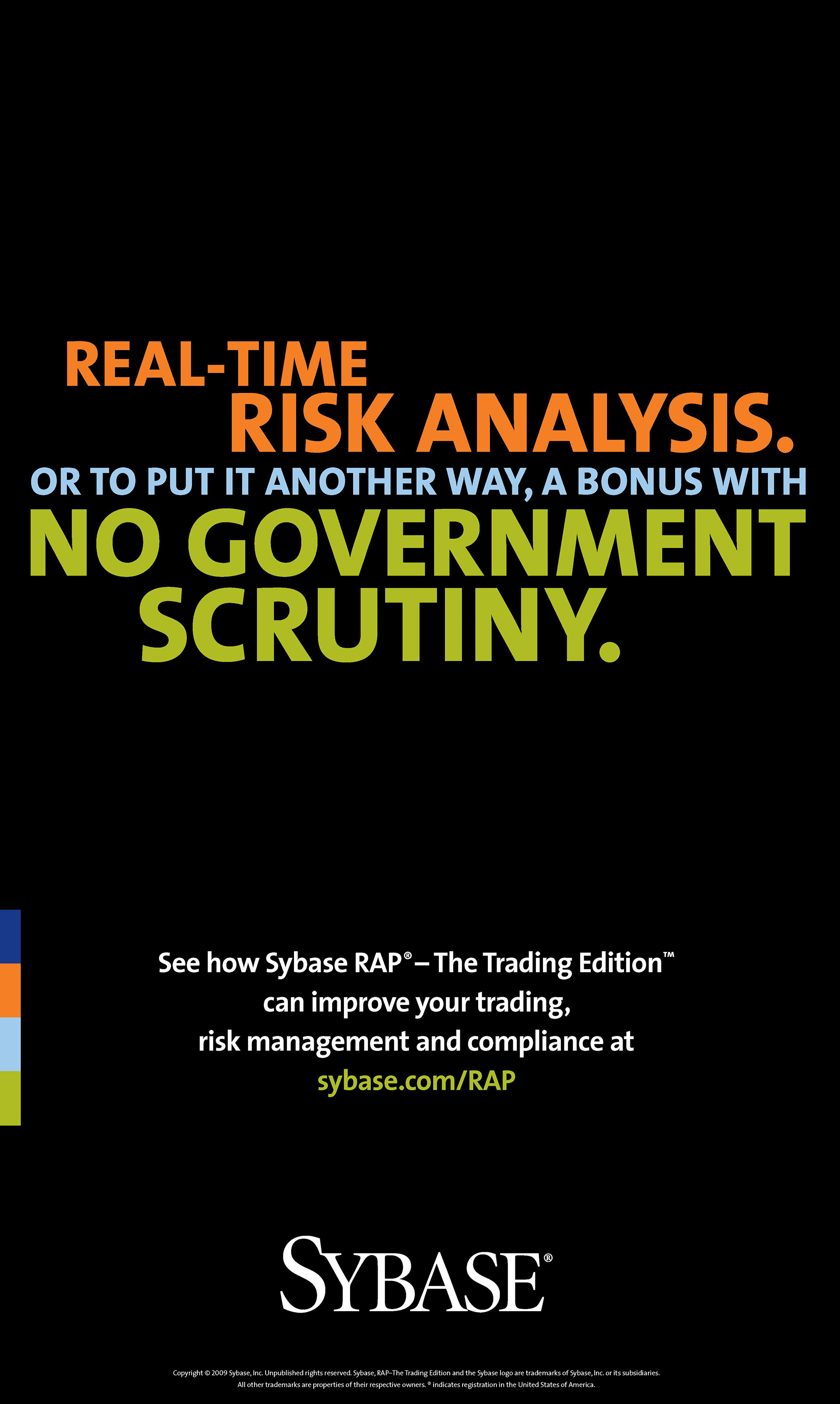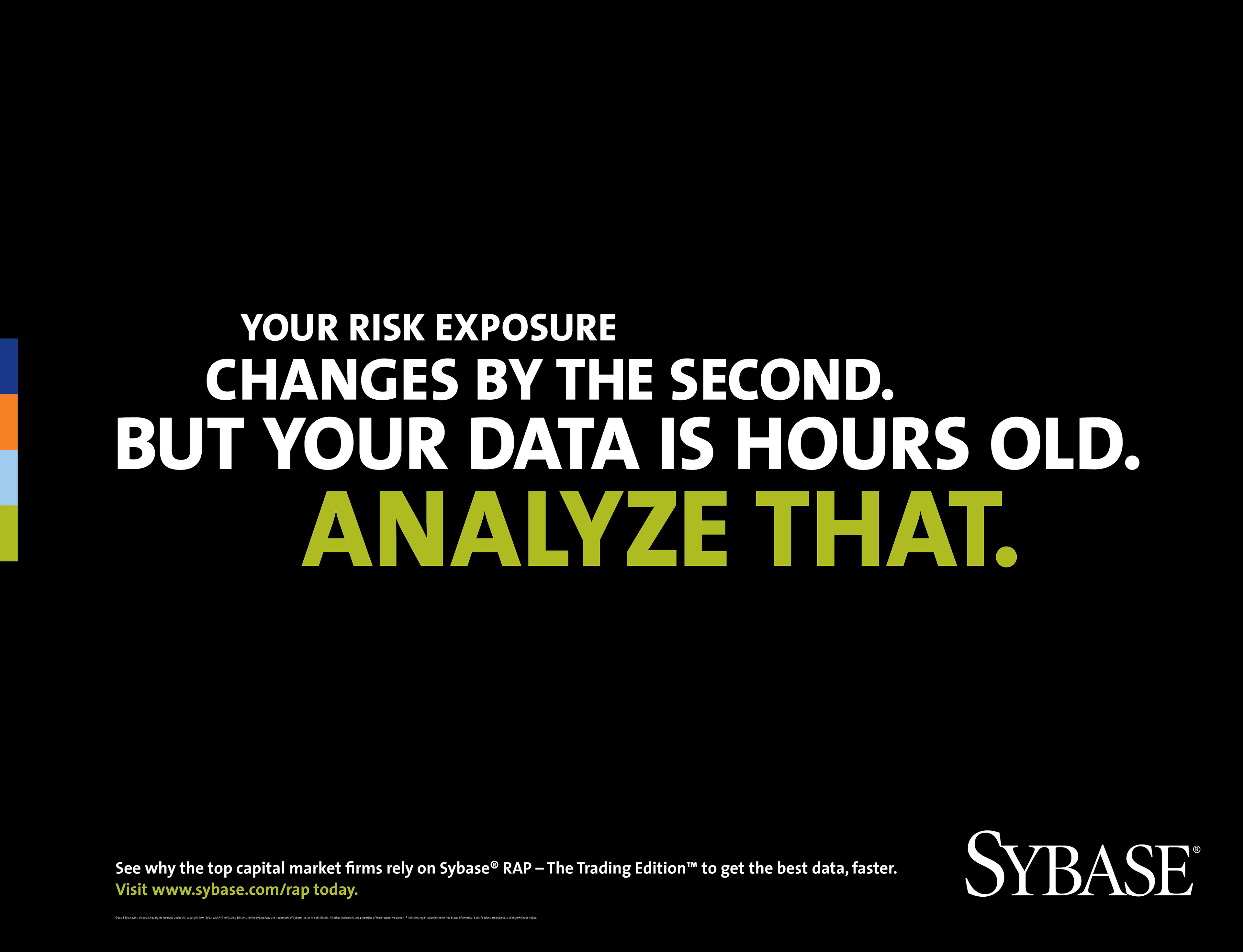 OOH campaign developed at the height of the financial meltdown of 2007-2008 to promote Sybase's new Risk Analytics solution. The campaign was hyper-targeted to initially run only in the subway stations and train cars around Wall Street.